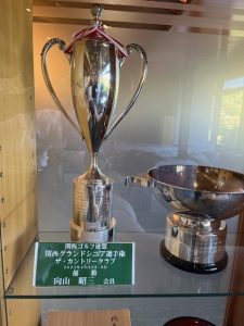 向山さんは「関西グランドシニアの優勝杯を、奈良柳生CCの優勝杯の飾り棚で1年間預かってください。」とのことで早速、ロビー横の優勝杯飾り棚にお預かりしました。